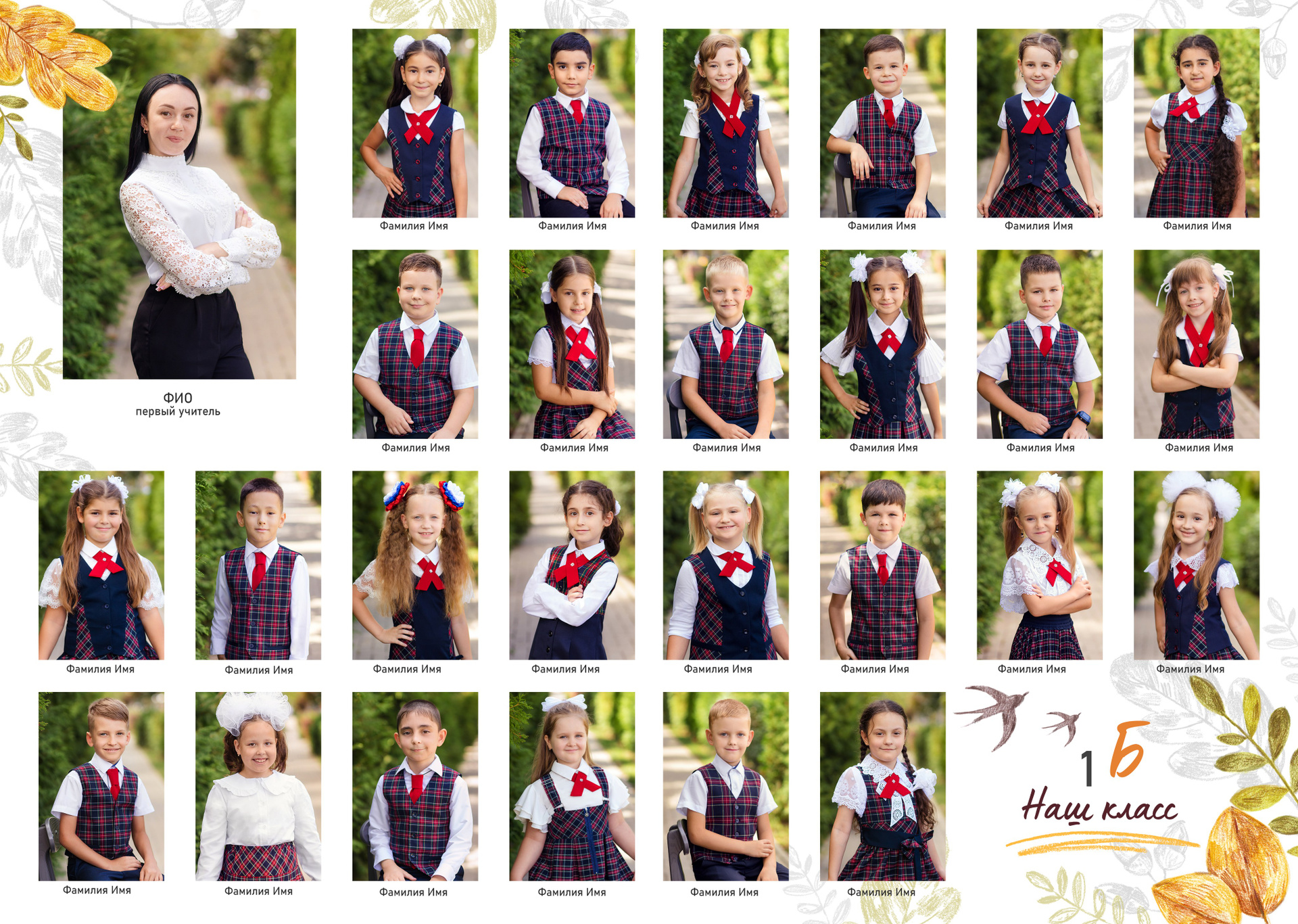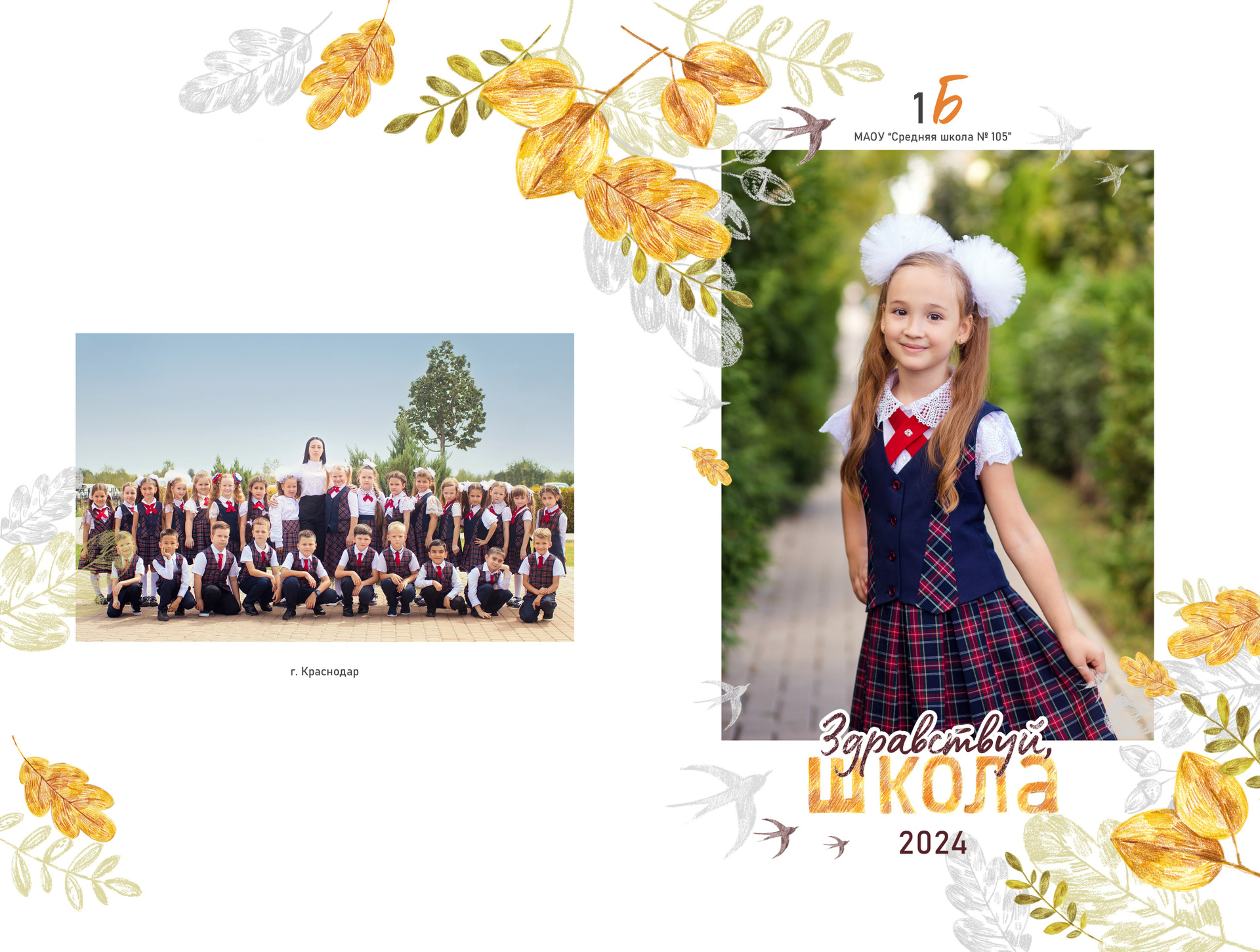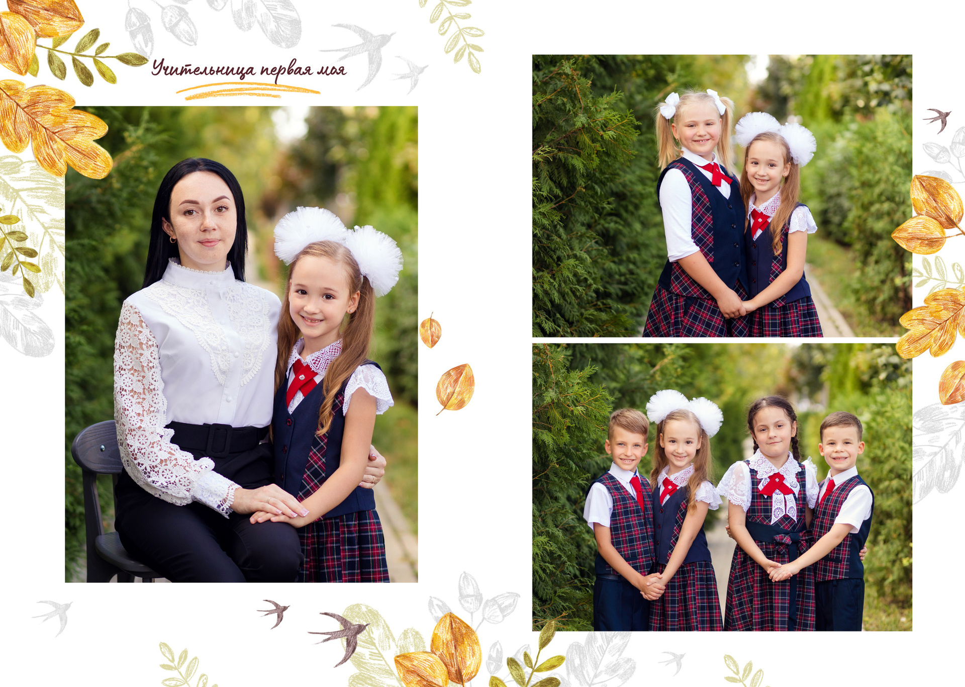 - Разворот — постановочные фото, съемка на улице (в библиотеке, в классе) в школьной форме — 3 фото: с другом, с учителем, групповое
